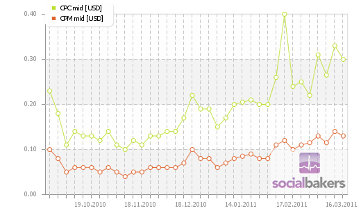 Az alábbi grafikonon pontosan látszik, hogy az egy kattintásért fizetett összeg 0,10 USD cent és 0,30 USD cent között mozog átlagosan.