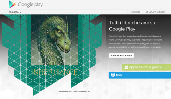 Tegnap olasz nyelvű e-könyvekkel bővítette e-könyvesboltját a Google. Az olaszországi internetezők, illetve okostelefon- és tablethasználók számára elérhetővé vált Libri su Google Play több mint kétmillió elektronikus kötettel nyit, köztük a legnagyobb helyi kiadók – sok más mellett a Mondadori, az Einaudi, a Feltrinelli – és nemzetközi kiadók digitális repertoárjával.