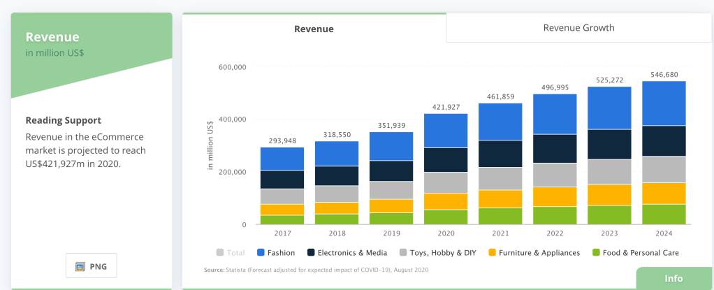 A piaci adatok a globális digitális vásárlói penetráció folyamatos növekedését sugallják. Az online vásárlás nem az egyetlen módja az internetes pénzkeresésnek – a statisztikák szerint a digitális tartalom növekedése növekszik az olyan e-kereskedelmi platformokon keresztül, mint az iTunes, a Google Play vagy a Steam, valamint az online hirdetések és marketing hatalmas piacán. Az olyan globális vállalatok, mint a Google, az Amazon és a Baidu, bevételeik nagy részét online szolgáltatások révén generálják.