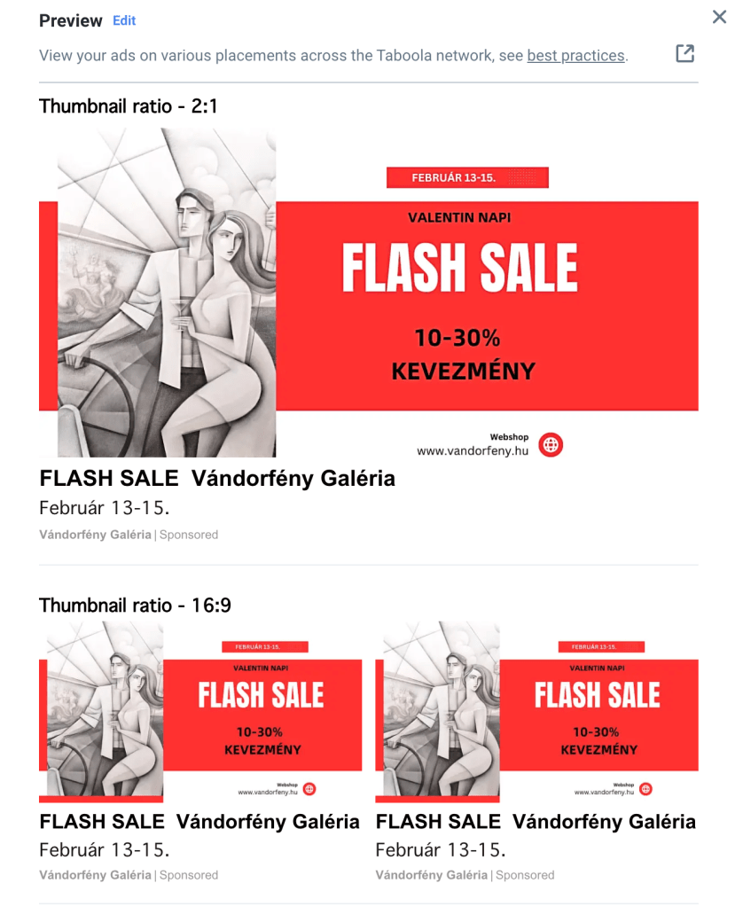 - A Taboola Címek és Indexképek Bevált gyakorlatai webhely, hogy könnyen hivatkozhassanak a kreatív specifikációira.