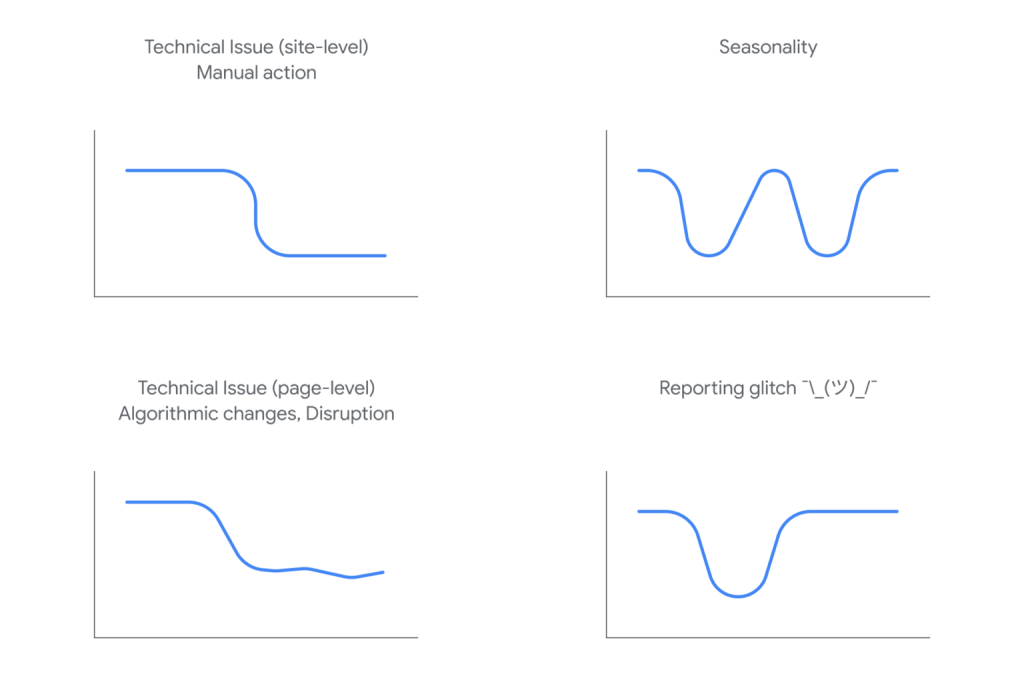 A forgalom csökkenésének típusai. A Google vázlatokat tett közzé „a cseppek példáiról és azok lehetséges jelentőségéről”. Ez vizuálisan megmutatja, hogyan néz ki az egész webhelyre kiterjedő technikai probléma vagy a kézi műveletek a keresési forgalom normál szezonalitásához képest, összehasonlítva egy oldalszintű technikai problémával vagy egy algoritmus-változással (például egy alapfrissítéssel) vagy egyszerűen jelentési hibával Search Console.