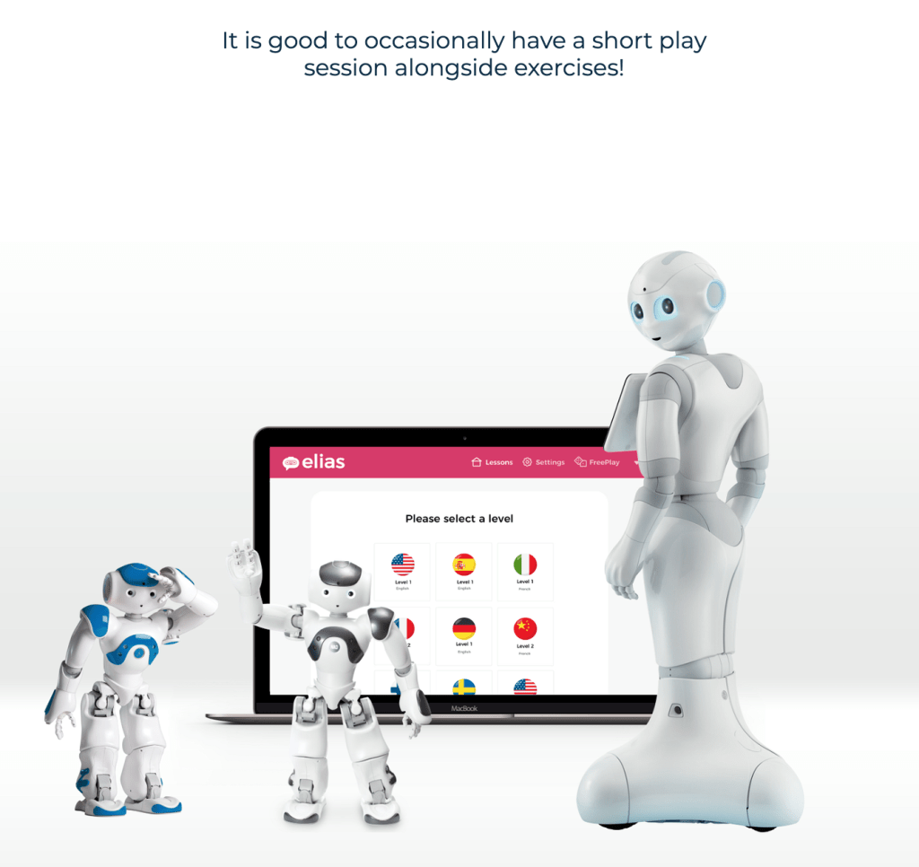 Az Elias Robot a nyelvtanulási megoldás, amely a barátságos robottal való beszédkészség gyakorlásának interaktív élményére összpontosít. A program során az Elias Robotot három iskolában kísérletezték Olaszországban, Portugáliában és Spanyolországban. Ez utóbbi a C.E.I.P. A Bec de l’Aguila, amely az Elias Robotot hibrid tanulási környezetben használta fel, lehetővé téve a diákok számára, hogy bemelegítő nyelvi gyakorlatokkal kezdjék a napot az osztályon belül Elias Robottal, és otthon folytathassák az angolul beszélő gyakorlatokat asztali vagy mobileszközökkel.