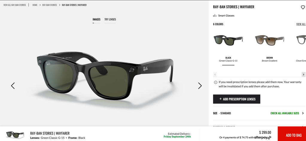 A Facebook-tal és az EssilorLuxottica-val együttműködésben épített Ray-Ban Stories ára 299 USD-tól kezdődik, és 20 stíluskombinációban lesz megvásárolható online és egyes kiskereskedelmi üzletekben az Egyesült Államokban, valamint Ausztráliában, Kanadában, Írországban, Olaszországban és az Egyesült Királyságban.