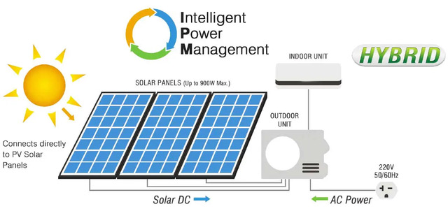 A hibrid napenergiával működő klímaberendezések zökkenőmentesen működhetnek egyen- és váltakozó áramról is.