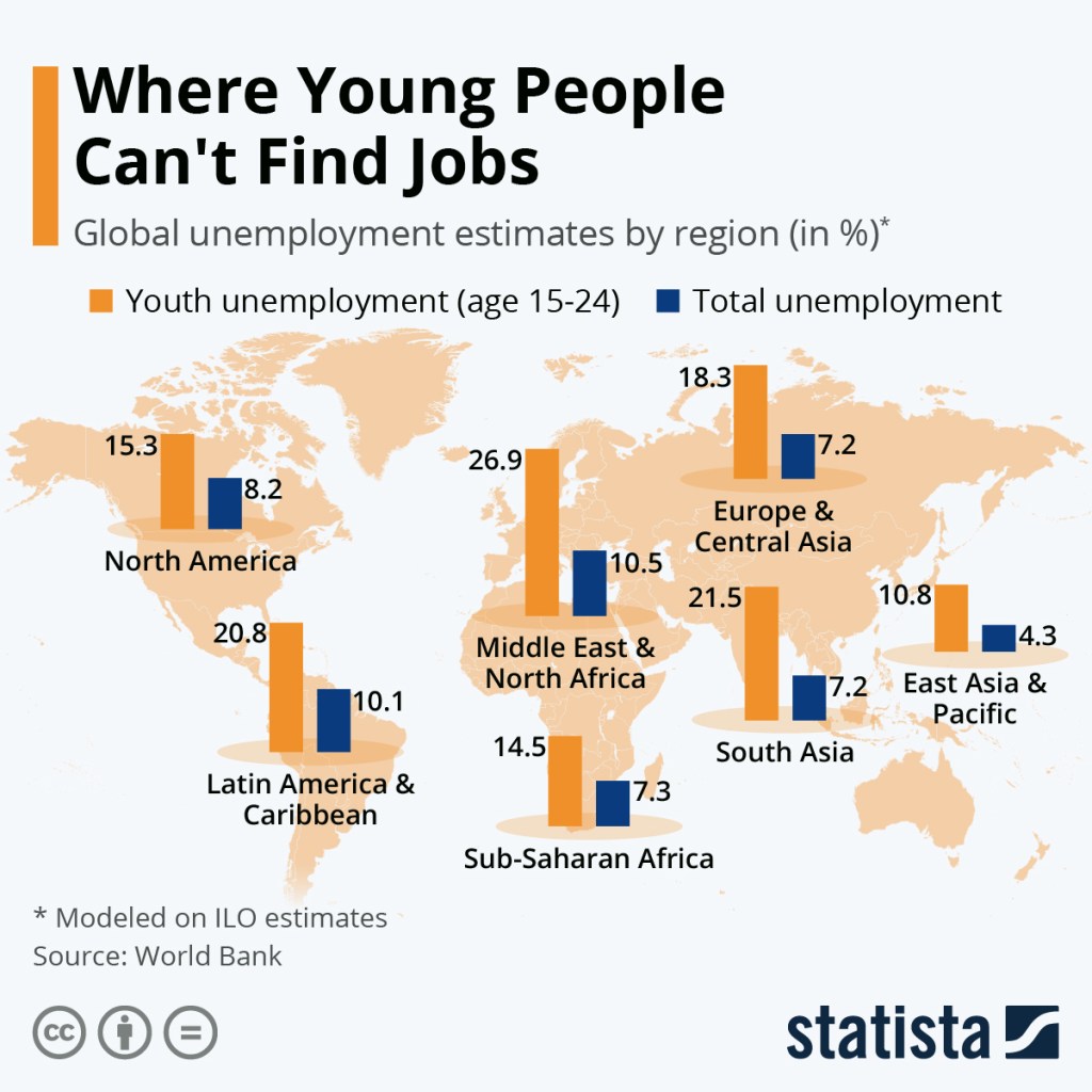 Éppen ellenkezőleg, a Világbank adatai szerint a Nemzetközi Munkaügyi Szervezet 2020-as modellje alapján az Egyesült Államokból és Kanadából álló régió a hét közül az ötödik helyen áll a fiatalok munkanélküliségét tekintve, és a harmadik a teljes munkanélküliség tekintetében. Kanadában elterjedt, ahol a becslések szerint a fiatal álláskeresők 20 százaléka nem talál munkát, ami hasonló az olyan országokhoz, mint Puerto Rico, Litvánia, Franciaország és Nigéria. Összességében a munkanélküliek legalacsonyabb százaléka a kelet-ázsiai és a csendes-óceáni térségben található, függetlenül attól, hogy a 15 és 24 év közöttiek csoportjába tartoznak. Ott a dolgozni akaró emberek mindössze négy százaléka nem talál munkát, miközben a fiatalok körülbelül tizenegy százaléka volt munkanélküli 2020-ban.