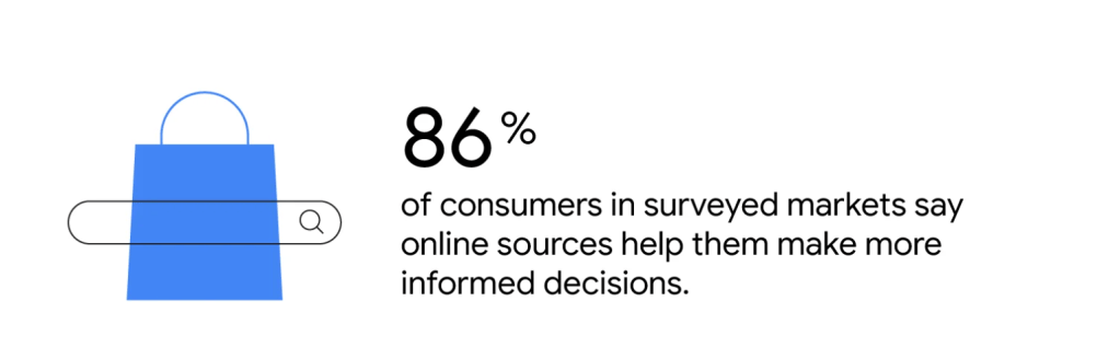 Akár a vásárlók keresik a termékeket, akár alkudnak, a digitális források kritikusak. A megkérdezett piacokon a fogyasztók 86 százaléka azt állítja, hogy az online források segítenek megalapozottabb döntéseket hozni.9 Ebben a szezonban a Google továbbra is kulcsszerepet játszik, a vizsgált piacokon 10 ünnepi vásárló közül majdnem kilenc azt mondta, hogy a Google segítségével segített vásárlás.
