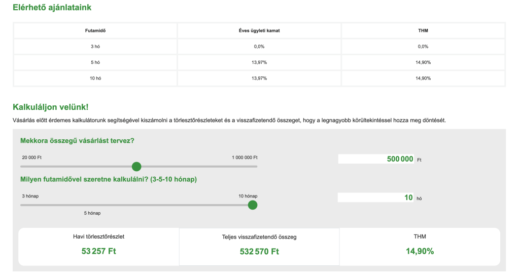 A vásárlás előtt érdemes kalkulátoruk segítségével kiszámolni a törlesztőrészleteket és a visszafizetendő összeget, hogy megfontolt döntést hozhassanak.