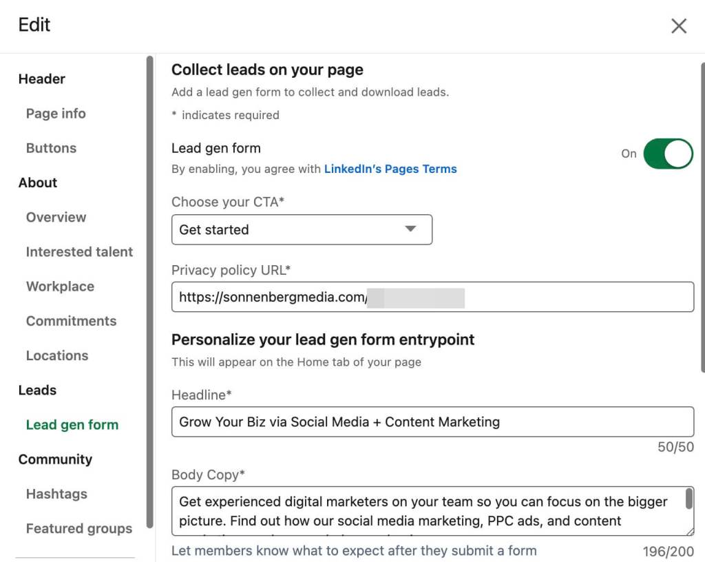 Ennek a natív űrlapnak a létrehozásához kattintson a LinkedIn vállalati oldalának szerkesztésére, és görgessen le a Lead Gen Form fülre. Kapcsolja be a leadgenerálás opciót, és adjon meg egy linket az adatvédelmi szabályzatára. Válasszon egy olyan cselekvésfelhívást (CTA), amely összhangban van azzal, amit az érdeklődőkkel szeretne, például Kapcsolatfelvétel az értékesítéssel vagy Ingyenes próbaverzió indítása.