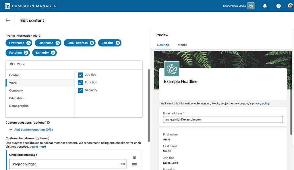 Bár a LinkedIn rengeteg lehetőséget kínál a minősített leadek organikus úton történő generálására, érdemes a kampánymenedzserben a fizetett lehetőségeket is felfedezni. Ha leadgeneráló hirdetéseket futtatsz, akkor hagyhatod, hogy a LinkedIn megtalálja a számodra megfelelő közönséget, és automatikusan kezelje a minősítési folyamatot. Mivel testre szabhatja a LinkedIn lead gen űrlapok mezőjét, a cégmérettől kezdve a költségvetési szintig bármit kérhet, bármilyen információt, amire szüksége van az érdeklődő minősítéséhez.