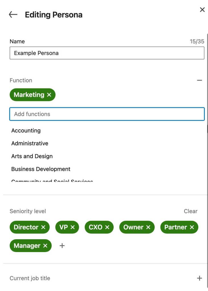 A megfelelő érdeklődők megtalálásához használja a Sales Navigator Persona eszközét, amellyel lényegében felépítheti ICP-jét. Nyissa meg az eszközt, és válasszon a szakmai funkciók, vezetői szintek, munkakörök és földrajzi helyek listájából. Ezután indítson új lead-keresést a Sales Navigatorban, és alkalmazza szűrőként a személyiségét. A keresés pontosabbá tételéhez bármikor hozzáadhat további szűrőket.