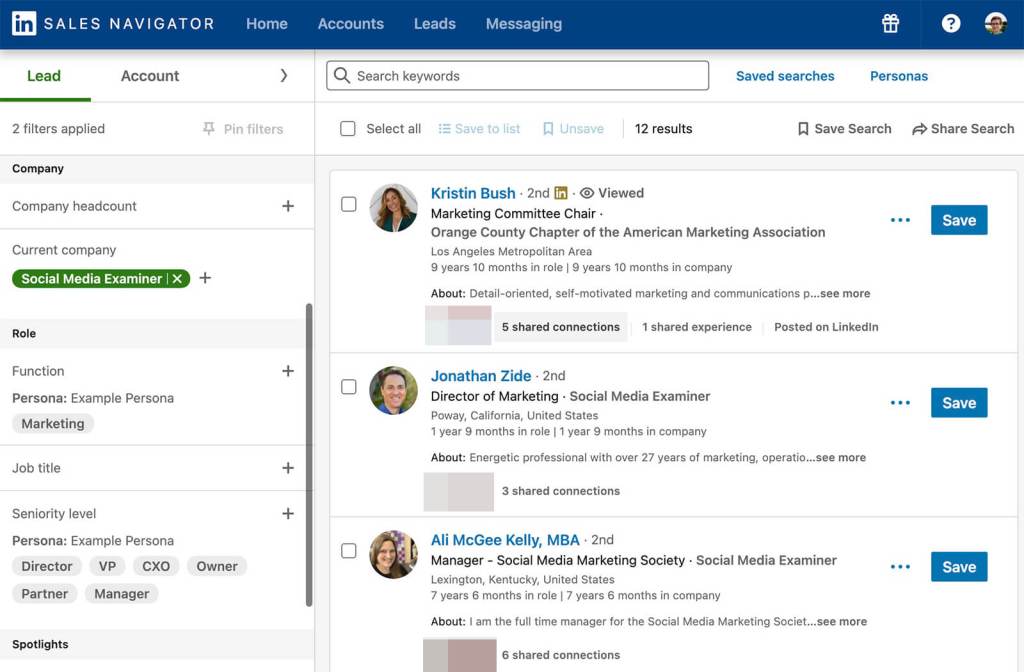 Az alábbi példa egy személyiségszűrőt mutat egy aktuális vállalati szűrővel rétegezve, amely a Social Media Examiner marketingvezetőit és menedzsereit jeleníti meg. A találatok további szűréséhez rákattintva bármelyik tag profilját megtekintheti, és listára mentheti a potenciális érdeklődőket.