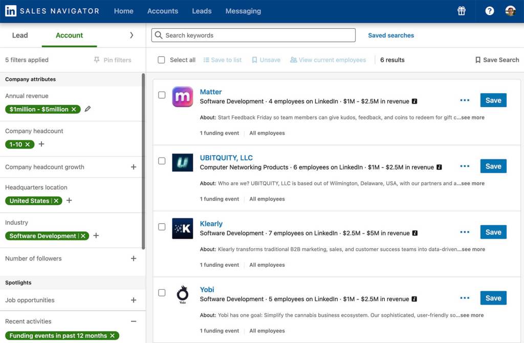 Alternatívaként használhatja a Sales Navigator fiókalapú keresését is, hogy azonosítsa az ideális ügyfélnek megfelelő vállalatokat. Az alábbi példa olyan kis szoftvercégek fiókalapú keresését mutatja, amelyeknek az elmúlt évben sikeres finanszírozási eseményeik voltak.