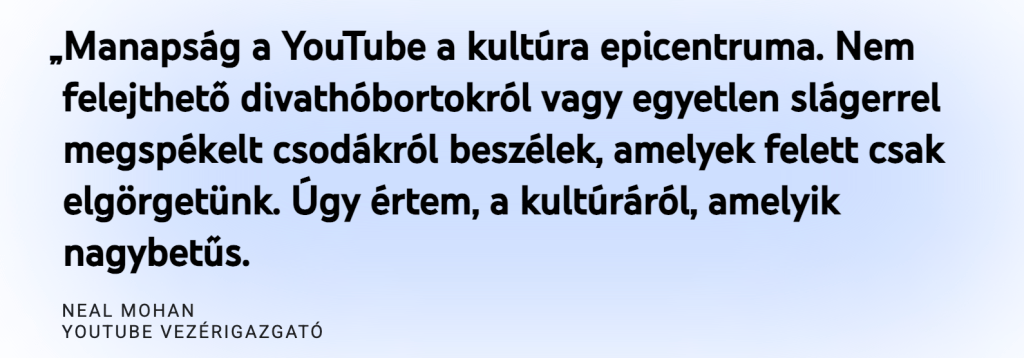 „Manapság a YouTube a kultúra epicentruma. Nem felejthető divathóbortokról vagy egyetlen slágerrel megspékelt csodákról beszélek, amelyek felett csak elgörgetünk. Úgy értem, a kultúráról, amelyik nagybetűs.