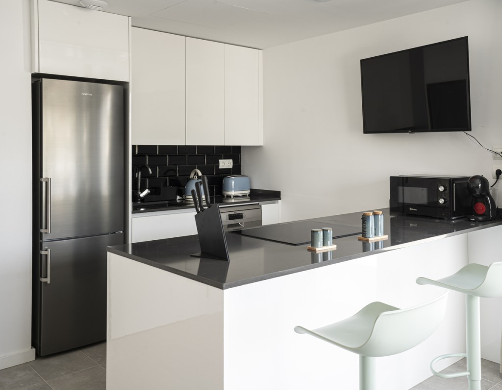 A lakás kiegyensúlyozott elrendezésével és a belső terek kényelmével tűnik ki. A nappali egy napsütötte teraszra nyílik, így egész évben élvezheti a természetes fényt és a békés, nyitott környezetet. A konyha zökkenőmentesen kapcsolódik a nappali-étkezőhöz, modern és hívogató hangulatot teremtve.