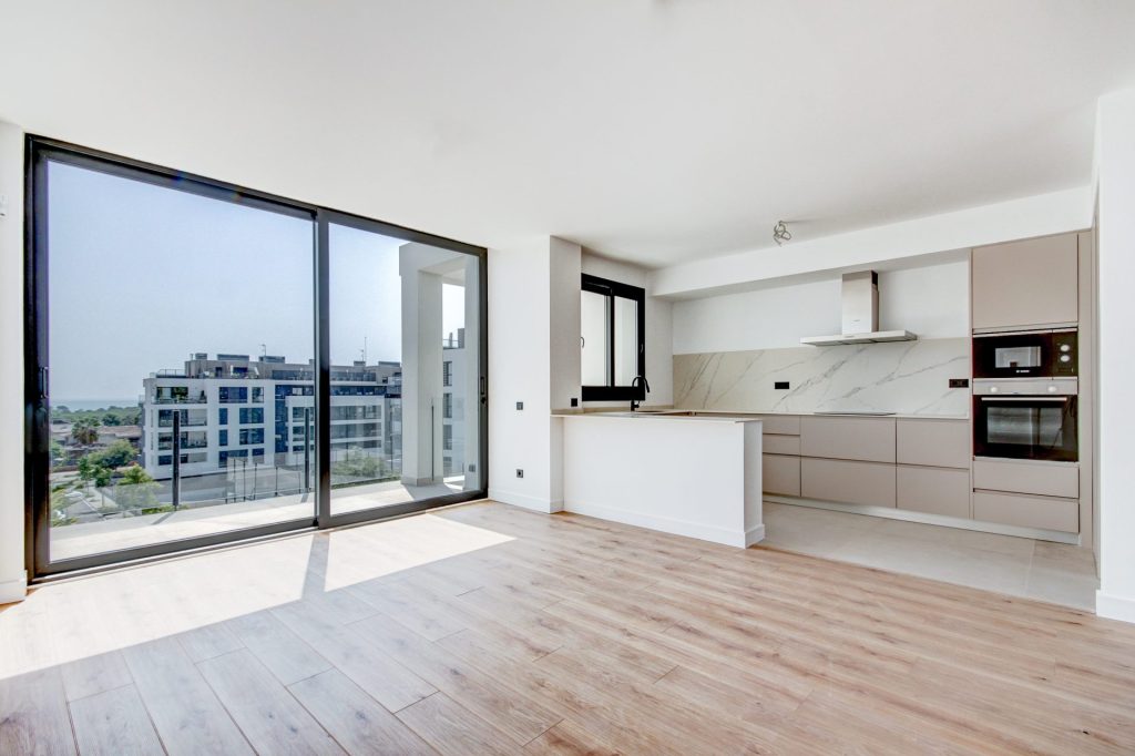 Ez a látványos, új építésű sarokpenthouse lakás tágas külsővel, kialakításával és bőséges természetes fénnyel tűnik ki. A belső tér modern, minimalista stílussal büszkélkedhet, amely fokozza az elegáns térérzetet. Tartalmaz egy nagy, teljesen üvegezett nappalit és étkezőt, modern, beépített konyhával, amely elárasztja a természetes fénnyel és egy 65 m²-es sarokteraszra nyílik; két kétágyas hálószobát, az egyikhez saját fürdőszoba tartozik (melaminnal bélelt beépített szekrényekkel); és egy másik teljes fürdőszobát. Minden szoba kifelé néz, és a fő teraszra vagy egy privát erkélyre nyílik kijárat.