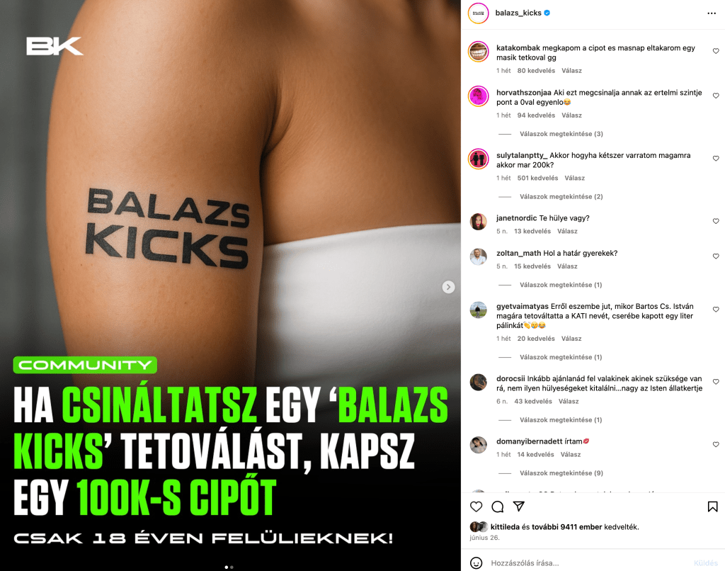 Képzeld el, ahogy ülsz a tetoválószalonban, remegve, mert nem az új dizájn fáj – hanem a felismerés: most komolyan belevésed a testedbe egy cipőbolt logóját… mindezt egy pár sneakert érő “ajándékért”. Végül is, miért is ne? Egyeseknek Rolex van a csuklójukon, neked meg a Bálázs Kicks a bicepszen.