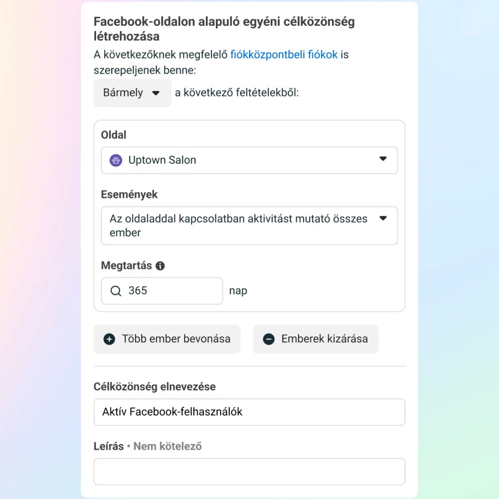 Ha végeztél, ezt az egyéni célközönséget állítsd be a hirdetéssorozat létrehozása során.